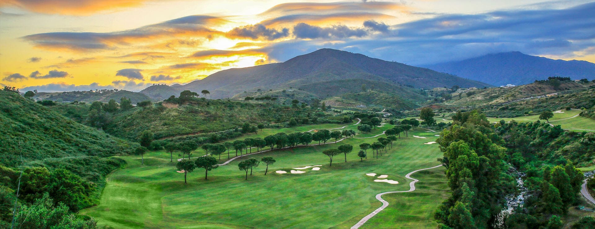 The Europa Course is easier for the average golfer, with generous fairways, flatter terrain and slightly larger greens than at America and Asia. Notable for one main bridge and four smaller bridges across the River Ojen, which features on eight holes, cutting across three fairways. There are four tunnels for golf carts. Water hazards guard the greens at the 3rd and 14th which is a memorable par-3 challenge at 254 yards.